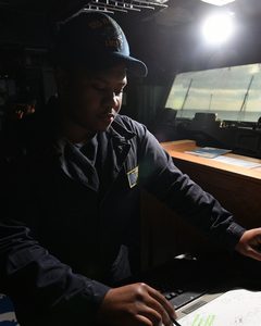 LTJG Travis Bridges of Miami reviews a maneuvering board used for tracking surface contacts while standing Junior Officer of the Watch on the bridge of the amphibious assault ship USS Bataan (LHD 5). Bataan is underway in the Atlantic Ocean conducting Composite Training Unit Exercise (COMPTUEX) with the Bataan Amphibious Ready Group in preparation for an upcoming deployment.