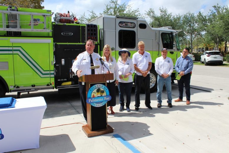 Mayor Karyn Cunningham made the introductions and Vice Mayor John DuBois, Councilmembers Patrick Fiore and Marsha Matson were there on behalf of the village. Miami-Dade Fire Chief Dave Downey and more than a dozen firefighters participated as did members of the village police department. Miami-Dade County District 8 Commissioner Daniella Levine Cava spoke, and Omar Blanco, president of Metro-Dade Firefighters IAFF Local 1403, represented union firefighters.