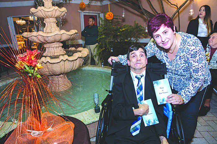 A special moment occurred for Spanish-born poet Raul Tamame, 52, (pictured with Maggie Miranda, director of activities at The Palace Renaissance in Kendall) on Nov. 20. Publication of the third volume of his poetry, which he continues to write despite having cerebral palsy that renders him voiceless, was marked with readings of his works to community residents, along with a DVD video by the Archdiocese of Miami that traces Tamame’s life history. A resident of the U.S. since 1979, Tamame has been writing poetry since his early 20s and his newest work was listed among the 25 “Best Books of November” by iBooks. Regularly corresponding with readers by email, his latest poetry can be accessed at www.silent-poet.com.