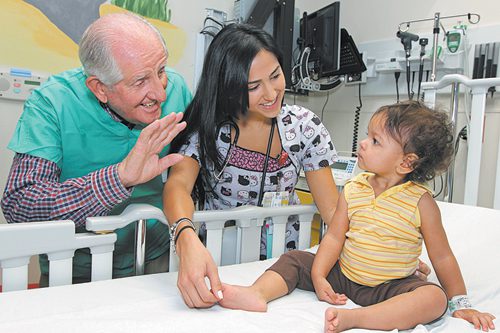 Community leaders and board members of Baptist Hospital spent a recent morning working alongside nurses at the annual Shadow a Nurse Day event held during National Nurse Week. Baptist Hospital Board member Paul May, who shadowed Jacqueline Rodriguez, RN, in Baptist Children’s Hospital Emergency Department, waves “hello” to one-year-old Anniela Viamonte Acosta.