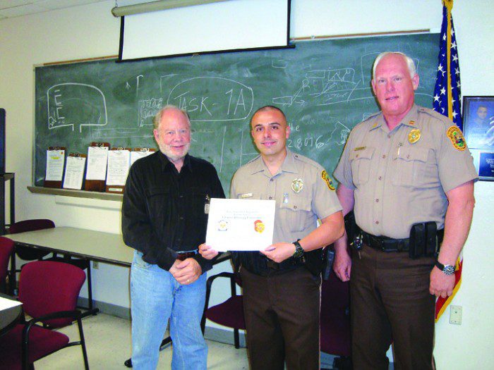 Officer Javier Pelayo (center) was named Kendall Police District Officer of the Month in February and awarded a special citation by Citizens Advisory Committee chair Barry White (left) and Capt. Gregory Dohring. On Nov. 18, Pelayo identified and later arrested a suspected thief who confessed to stealing over $1,500 in items and cash in early morning hours from 12 cars at the Venezia Lakes community in West Kendall. All the cars were left unlocked in the gated community overnight but in this case, the property was recovered and returned to the owners.