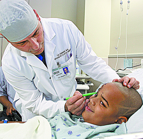 Plastic surgeon Tal Roudner, MD, marks the area where he will revise a scar on the forehead of patient Elio Cases, 8.