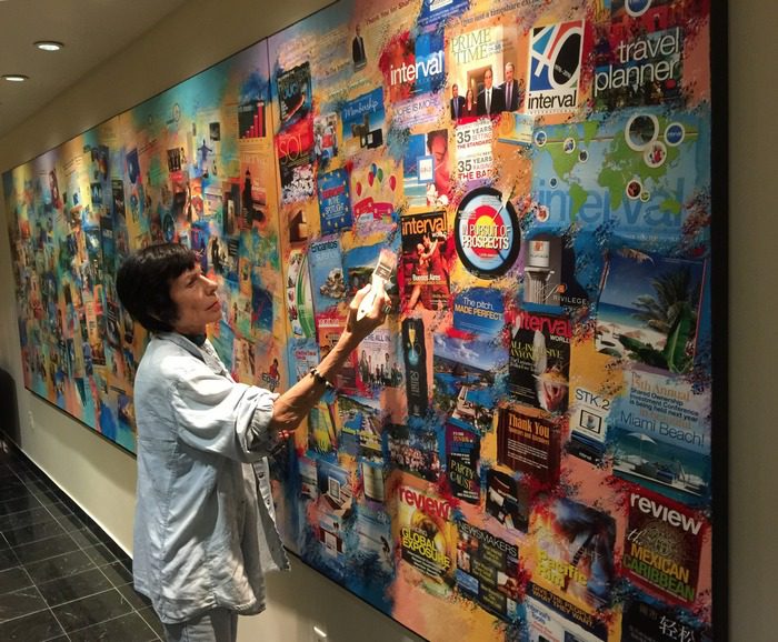 Renowned collage artist Erika King puts the finishing touches on one of her latest creations commissioned by Miami-based Interval International in celebration of its 40th anniversary. The colorful canvas is the second installment in the series, depicting the company’s history as a leader in the vacation ownership market, with a mix of photographs and news articles. Today, Interval is part of a publicly traded company and about 2 million families are enrolled in its membership programs.