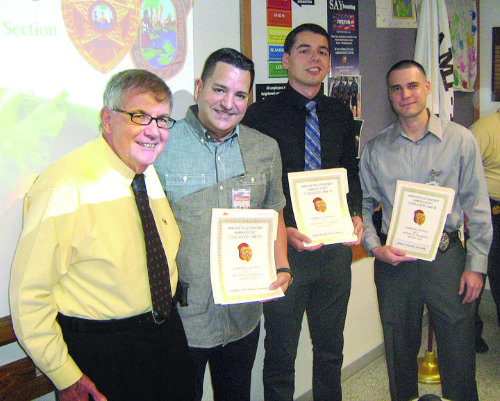Courage plus teamwork earned Officer of the Month citations for three Miami-Dade Police Hammocks District officers who prevented a potential suicide by a razor-threatening male on June 6. Called to a family home, the officers used crisis intervention training to prevent an individual from self-harm beyond that already inflicted. They later saw his transfer to Kendall Regional Medical Center for treatment and the expectation of full recovery from the incident. Pictured at the presentation are (l-r) Citizens Advisory Committee (CAC) chair James Blough presenting awards to Officers Andres Saenz, Erik Armas and Jonathan Horovitz at the CAC Aug. 27 meeting.