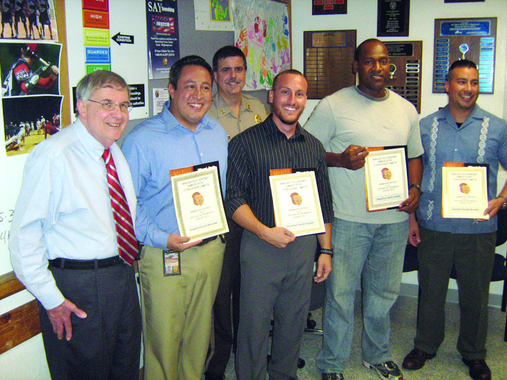 Members of a six-man team of officers from the Miami-Dade Police Hammocks District earned co-honors as Officer of the Month for August following thefts of 135 propane gas tanks from nine locations in West Kendall, including several from Walgreens stores. As part of surveillance guided by potential hazards and national security, tracking devices were placed on outside tanks at different sites, resulting in activation of one that identified a moving vehicle northbound on SW 152nd Avenue at 1 a.m. on Aug. 11. The vehicle was stopped and two suspects arrested when 18 propane tanks were discovered in the vehicle. Honored at the Aug. 28 CAC meeting for their work in solving the case by Citizens Advisory Committee chair James Blough (far left) are (l-r) Sgt. Edgar Bermudez, Det. Daniel Zapata, Det. Devon Dolam, and Det. Romelio Martinez with Capt. Miguel Hernandez (rear). Not pictured are Det. Miguel Garcia and Det. Charles Castillo.