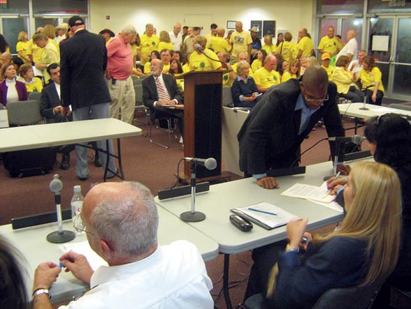 Backed by more than 200 Horse Country supporters in yellow T-shirts attending the three-hour session at the Kendall Village Center civic pavilion, Ron Weeks, HOA president and a 52-year resident, traced the history of preserving the agricultural nature of the Horse Country from 1946 through Master Plan studies in 1975 and 1981, and 30 years of mixed development applications.