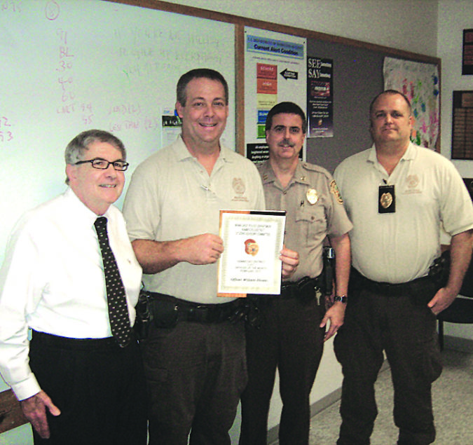 Miami-Dade Police Officer William Hilson (second from left) used an inner pants belt to place a tourniquet on the thigh of the severed left leg of an off-duty Customs and Border Protection Officer after a Feb. 13 motorcycling accident on Card Sound Road. “The quick actions of Officer Hilson were instrumental in saving the victim’s life,” according to the “Officer of the Month” citation, presented Feb. 25 by Hammocks Citizens Advisory Committee chair James Blough (left) along with Capt. Miguel Hernandez and Sgt. Richard Zhalka (right of Hilson). Immediate action by Officer Hilson who serves in the South Regional Agricultural Patrol Section of the Miam-Dade Police Hammocks District staunched blood flow before an emergency rescue team arrived to continue lifesaving measures and airlift the injured officer to Kendall Regional Medical Center.