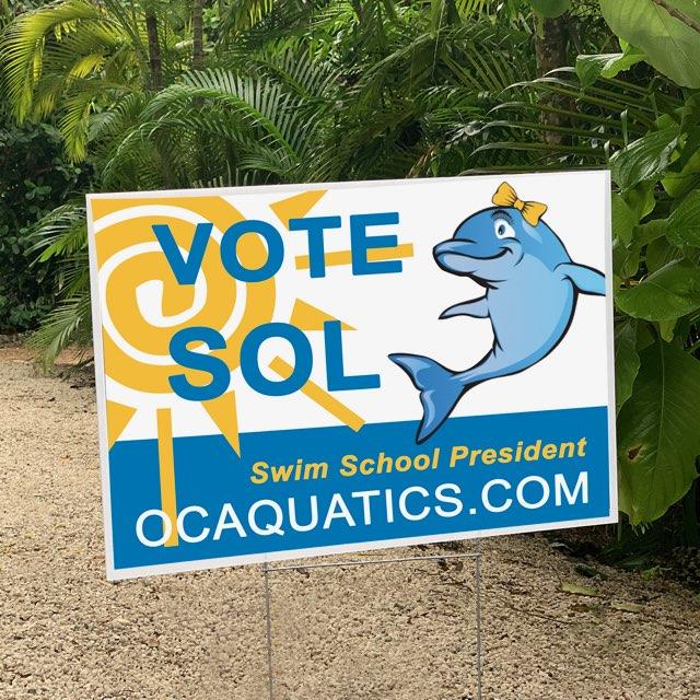 In keeping with the current political season, Ocaquatics Swim School is conducting an election for school president between Sunny and Sol, the swim school’s mascots.
