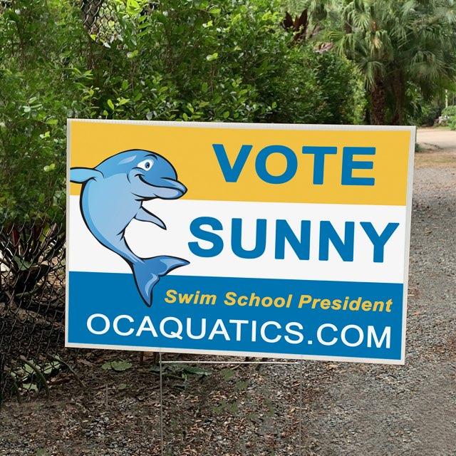 Swimmers can purchase campaign yard signs representing each candidate at the swim school locations and all proceeds go to Hope Floats Foundation which provides swimming lessons for children who can’t otherwise afford classes.