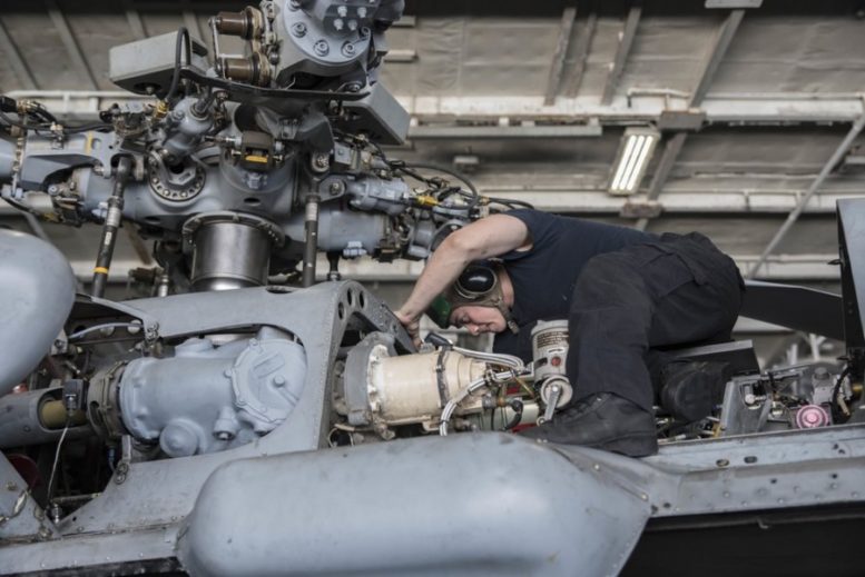 Aviation Structural Mechanic Second Class Diego Dominguez, from Miami, conducts a flight control bearing inspection on an MH-60S Sea Hawk helicopter assigned to the Dusty Dogs of Helicopter Sea Combat Squadron (HSC) 7 in the hangar bay of the aircraft carrier USS Dwight D. Eisenhower (CVN 69) (Ike). Ike and its Carrier Strike Group are deployed in support of Operation Inherent Resolve, maritime security operations and theater security cooperation efforts in the U.S. Fifth Fleet area of operations.