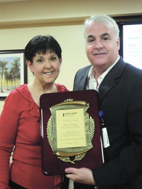 Manny Linares, CEO of North Shore Medical Center, recently recognized Oksana Baczyk, RN, as the 2015 recipient of the hospital’s annual President’s Award for her outstanding work and accomplishments throughout the year.