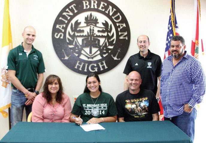 . Brendan High School senior Samantha Dominguez recently signed her letter of intent to play softball with Ursuline College in Ohio. Pictured are athletic director Julio Arnaiz, Mrs. Dominguez, Samantha, Mr. Dominguez, principal Jose Rodelgo-Bueno and coach Luis Padron.