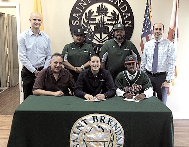 Baseball players Renny Tolentino and Christopher Torres signed with Mississippi Valley State and Wake Tech respectively. Pictured (l-r, front row) are Mr. Torres, Christopher Torres and Renny Tolentino; (back row) athletic director Junlio Arnaiz, assistant coach Cesar Rondon, head coach Luis Padron and principal Jose Rodelgo-Bueno.