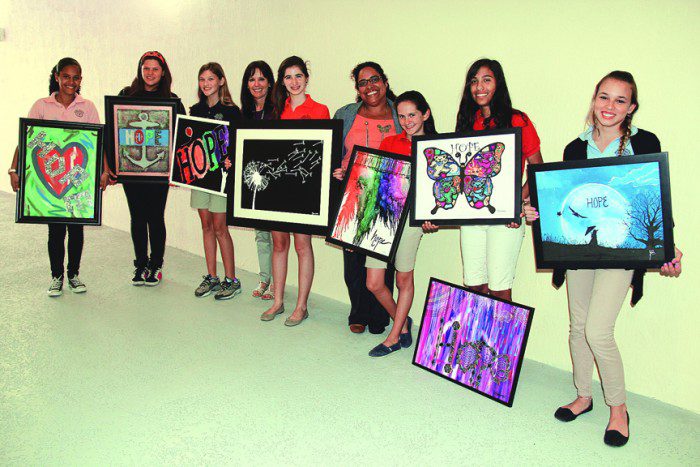 Riviera Prep School students donated their artwork to a silent auction benefiting research to combatHuntington’s Disease. The silent auction took place during a gala on May 4 at the Palmetto Bay Village Center. The following students are pictured with their art: Maya Masucci, Kelly Roberts, Gabriela Cedeira, Alexis Diaz, Bruna Giampetro, Ann Gottenger, Shelby Onabowale and Nicole Otero-Gomez. Also in the picture are Ms. Janis Klein-Young, the art teacher, and State Sen. Dwight Bullard’s assistant, Venus.