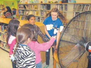 For more than four hours on Mar. 21, Emily, along with volunteer 4H advisor Julie Diaz, was busy in Hoover Elementary’s media center, teaching fourth grade students about the power of wind as a source of energy. Youngsters diligently cut out paddle shapes or divided Styrofoam cups in halves to fashion miniature pinwheels that whirled to impart a flow of energy.