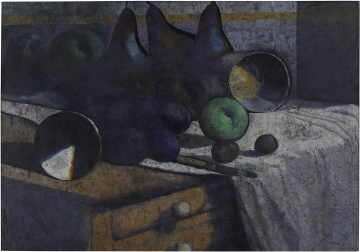 • Diego Rivera’s Naturaleza muerta, 1908, is an early example of the easel work that he was best known for before his adoption of the mural format. While the oil painting displays an affinity towards the composition and bold use of line of Paul Cézanne, it is notable for its clear rejection of more abstract tendencies.