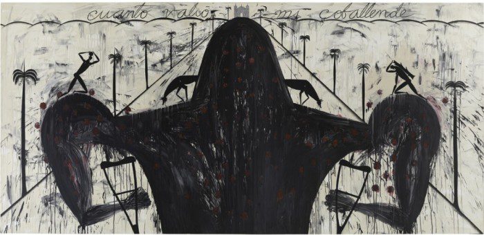 • Beatriz González’s Los Papagayos, 1987, which was painted on a long roll of heavy paper and subsequently cut and redistributed in multiple sections. The painting, which references the corruption and repression enacted by Colombian elected officials and military in recent history, depicts a line of men in military uniform interspersed with a recurring civilian figure dressed in suit and tie.