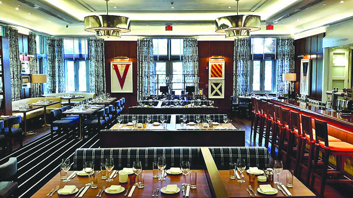 The open, airy layout and rich Art Deco ambiance channels the experience of dining on a luxury cruise liner, while the bar and main dining room evoke a sense of being on the high seas with sleek white banquettes and elegant floor-to-ceiling windows. The expansive private dining room boasts a raw bar and sushi bar, as well as a stunning stonecarved Art Deco fireplace and replica of the Queen Mary. Those looking to embrace the fresh ocean-air will enjoy dining on the terrace or patio complete with a private bar and ample outdoor seating.