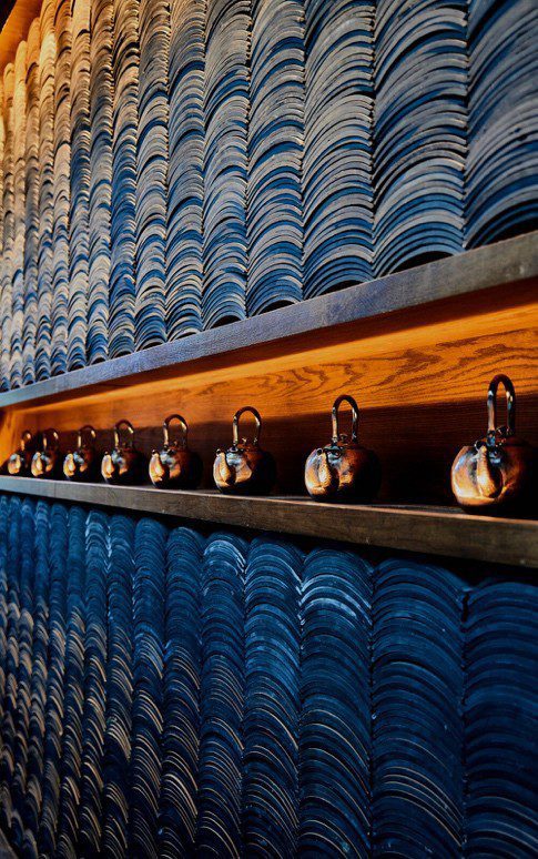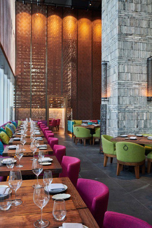 Upon entering Hutong, guests are welcomed in front of a row of copper Zhejiang teapots displayed among columns of stacked Chinese clay roof tiles. Around the walls of the triple-height room are 35,000 grey antique bricks, hand chiseled and transported from an architectural salvaged 1930s building in China. At the far end of the dining room stands wooden dynasty lattice screens hand-carved by Chinese craftsmen and embellished with intricate designs. The traditional Chinese elements are beautifully offset by dashes of vivid pop-art colors – bright fuchsia, turquoise and lime green chairs.