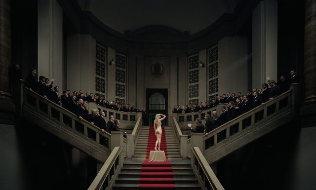 In Sook Kim’s depiction of modern life is at times shocking and provocative. Kim’s work is doused with themes of voyeurism, darkness, sex and isolation. These ideas are portrayed perfectly in her magnum opus, Saturday Night. At first glance what appears to be the exterior facade of a hotel is actually a grid of 66 individually staged rooms. The viewer is invited to peak inside each: a lonely pilot at the edge of the bed, an old couple sleeping, a young girl curled up crying, a woman hanging from a noose. The piece took three years to complete and sold at Sotheby’s Hong Kong in 2012 for $95,352. Her work, Auction furthers her theme of voyeurism and shock. The piece features a tall, blond, naked woman, standing on an auction block at the center of a staircase. A sea of business-suited men surround the woman, waiting for their chance to bid. The image stuns the viewer with contrasts between male and female, skin and cloth, dark and light, sex and business.