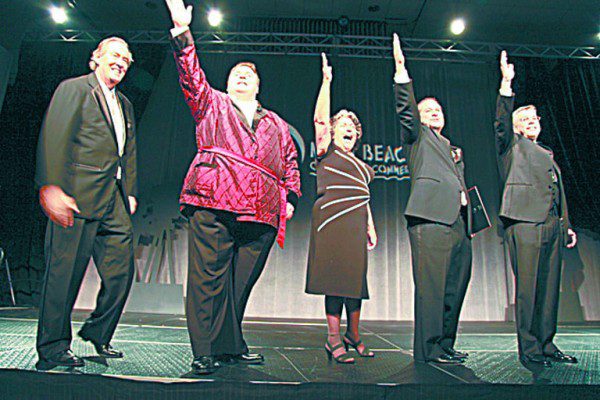 But the true emcee of the evening was Jackie Gleason, who is embodied by officially sanctioned Gleason impersonator Michael Walters. His capering, along with the sultry tunes of Marilyn Monroe impersonator Camille Terry, delighted the audience, especially when she headed into the audience to serenade “Mr. Miami Beach” Michael Aller with a honey-dripping rendition of “My Heart Belongs to Daddy.”