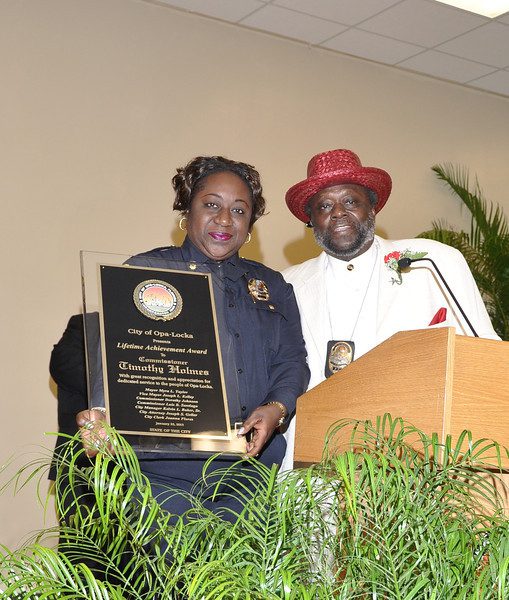 ommissioner Timothy Holmes earned Opa-locka’s first Lifetime Achievement Award given to him by Mayor Myra L. Taylor at the State-of-the- City Address in January.
