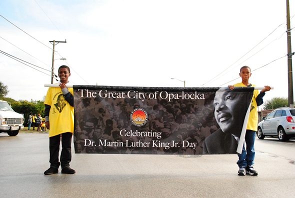 The leader of a monumental movement, Dr. King was accompanied on many occasions by people of all races and nationalities. Courageous children often stood in the front lines of water hoses and police dogs, while others lead protest through sit-ins at food counters, stretched their bodies across airport strips, and amidst the ever present threat of violence enrolled in all-white schools, among other demonstrations in the fight for freedom, justice and equality. Saturday, in the City of Opa-locka, with that same spirit of solidarity and pride, marchers of all ages and backgrounds, wearing gold shirts displaying a portrait of Dr. King, assembled at the Cultural Arts Center, 2105 Ali Baba Avenue to begin the walk, in memory of Dr. King’s legacy.