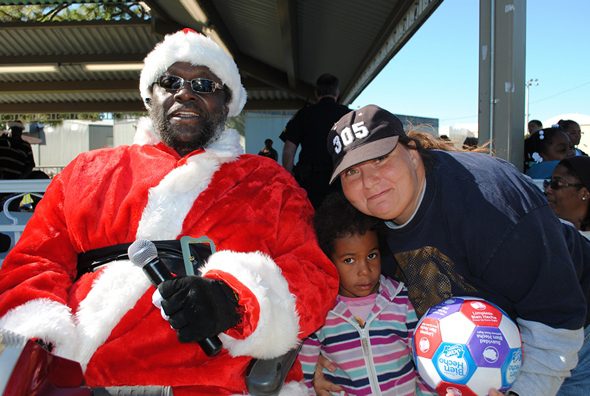 Prior to the start of the bike give-away, Commissioner Holmes requested that the huge crowd of excited parents and children pause to give a moment of silence for the families of the Sandy Hook massacre in Newtown, Connecticut who he commented, “…had their holidays altered, and the rest of their lives changed.” Holmes painfully remarked, as he stared into the distance before bowing for meditation, “Our hearts go out to them, as we count our blessings today.” Holmes composed himself and began a run-down on the rules for the raffle. “One child per household; the size of the bike will be based on the size of the child, who must be between ages 3 and 17; each parent must provide proof of Opalocka residency and be accompanied by their child; and finally, NO Saggy Pant wearers will receive a ticket,” he affirmed. Holmes was assisted by staff from various city departments as well as community volunteers who, due to the nature of the Commissioner’s “big heart,” had to remind “pleading parents” from neighboring cities or parents requesting tickets for their other children, that the Commissioner must stick to the rules. “Everyone knows that he is a giver, so we are here to assure that no one takes advantage of his generosity and that Opa-locka residents are provided for first,” stated volunteer Alvin Burks.