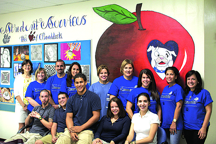 The students at G. Holmes Braddock continue to grace the walls of their school with mural, since its opening in 1990. Areas around the school such as Science Honor Society, SECME, FBLA, Media Center, Mu Alpha Theta, JROTC, and Marine Biology have adorned the hallways with murals. The Student Services department at Braddock was the most recent patrons to commission a mural in their department, completed in October. Pictured with the Student Services mural are (l-r, back row) Kathryn Holway, Barbara Moskowitz, Julio Perez, Carla Hoed de Beche, Liliana Maldonado, Carmen Molina-Churchman, Ana Burges, Tahimy Gomez, Maria Mendoza; (seated student artists) Jonathan Martin; Anthony Perez; Elier Acosta; Lorena