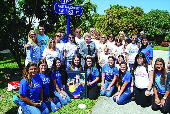 To commemorate her accomplishments on the anniversary date of the heartbreaking accident the village council voted at the beginning of April to codesignate the roadway at SW 80th Avenue and 162nd Street in honor of her. At the ceremony outside Southwood Middle School on Apr. 12 Kaely’s family and friends watched in somber reflection as Mayor Shelley Stanczyk and other members of the council removed the tarp covering the new sign.