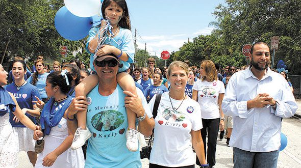 Kaely’s 17-year-old sister Bree Ann Camacho led the students with supporting family members all around her pushing strollers or carrying kids on shoulders. Each family member wore the same T-shirt featuring a smiling Kaely with her hands positioned upside down over her eyes in spectacle fashion while cheerful blue eyes peaked through.