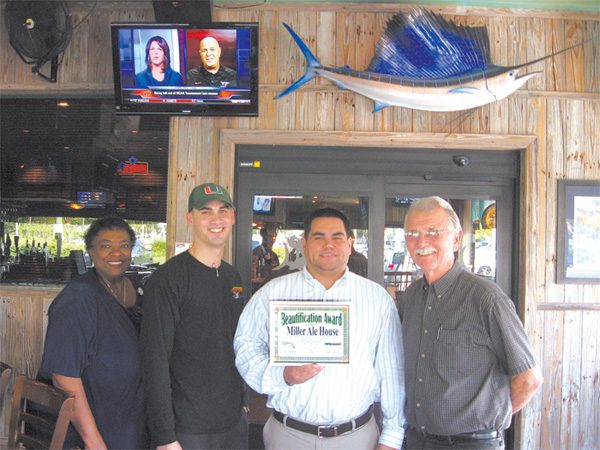 Miller Ale House, located at 13603 S. Dixie Hwy. in Palmetto Bay, was designated the recipient of the Beautification Award for the month of October by Total Bank and the Economic Development Council. Executive director Paul Neidhart and Frieda Brown, vice president of Total Bank, presented the award on Oct. 20.