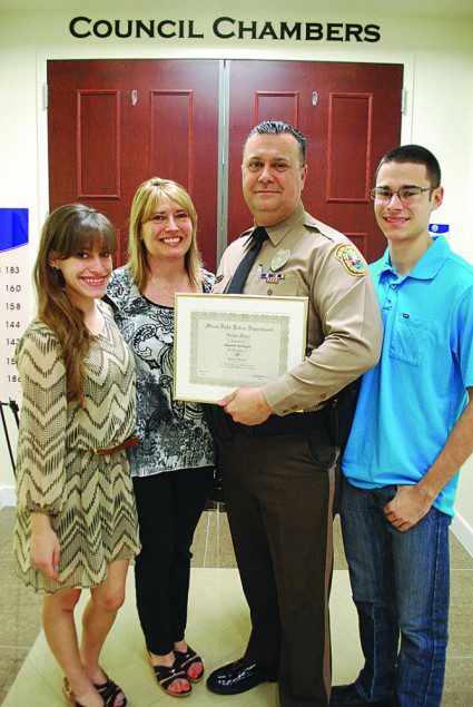 At the March 3rd Village Council Meeting a special moment came at the beginning of the session when Officer Alejandro Rodriguez, who serves in the Palmetto Bay Policing Unit, was recognized for 30 years of service with the Miami-Dade Police Department. Village Police Commander Greg Truitt presented Officer Rodriguez with a certificate honoring the achievement in a ceremony conducted at the podium with Mayor Shelley Stanczyk. Sharing the moment in the audience and later outside the council chambers for a photo were Rodriguez’s wife Diane and children Nichol and Alex. Congratulations to Officer Rodriguez, and thanks for all those years of dedicated effort protecting our residents.