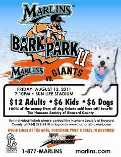 Bring your dog to watch the Florida Marlins battle the San Francisco Giants on Friday, Aug. 12, 7:10 p.m., at Sun Life Stadium and help raise money for the Humane Society of Greater Miami.