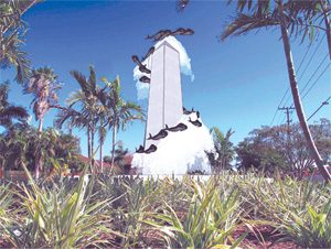 “The sculpture with the fish wraps around the obelisk, and it looks as if it’s moving as you drive around it in your vehicle,” Nuñez said. “In the daytime the fountain has a cascading water effect. At night the fountain turns off and it has some animation of lights.”