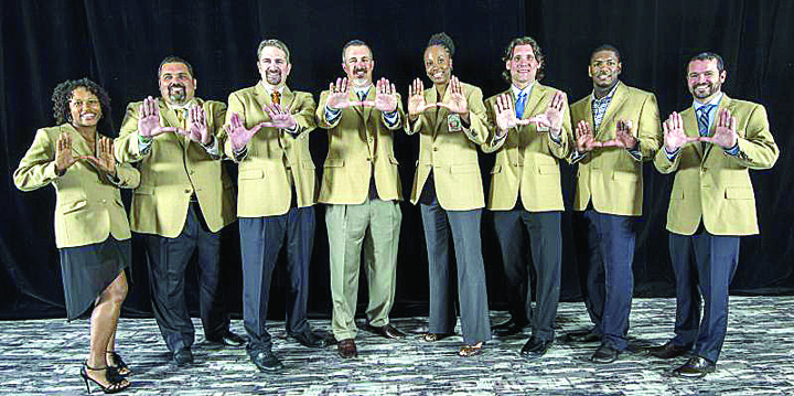 Pictured are the members of the 2015 UMSHoF induction class. They are (l-r) Lauryn Williams, Alex Fernandez, Rob Chudzinski, Kevin Patrick, Kym Hope, Rusty Medearis, Jonathan Vilma, Chris Mantilla. Not pictured are Winston Moss and the late Sean Taylor.