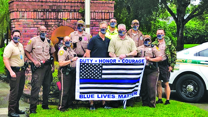 The Mangowood neighborhood of Palmetto Bay was out in force (and masks) on Saturday October 3 to give thanks and honors to the Police Department. David Greenwell, Vice President of South Florida PBA at Miami-Dade Police Department, as well as many dignitaries including Mayor Karyn Cunningham, braved the rain to gather at the flagpole monument.