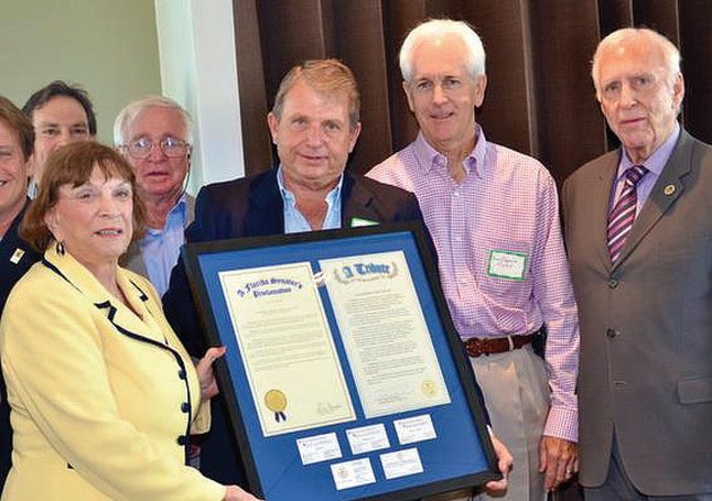 The 50th Anniversary Coconut Grove Arts Festival, held earlier this year, has been officially recognized in a proclamation from the state legislature for being a successful, ongoing event and “for contributions to the arts and arts education across not only South Florida, but also the regional cultural community.” On hand for the presentation of the proclamation at last month’s Coconut Grove Chamber of Commerce luncheon were (l-r) State Sen. Gwen Margolis, CGAF board member Dave Hill, chamber board members Jack Eads and Dan Eggland, and CGAF president Monty Trainer. The 51st edition of the Coconut Grove Arts Festival will take place next year Feb. 15-17.