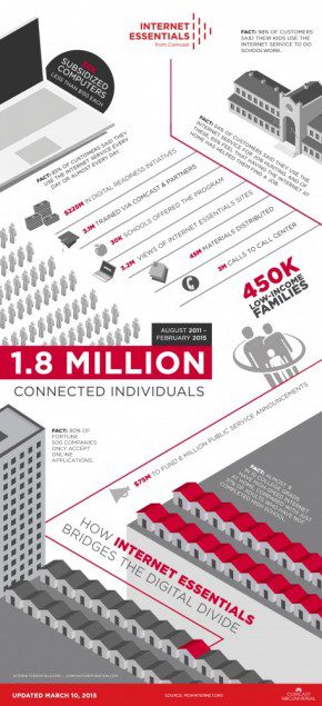 Through Internet Essentials, Comcast has sought to directly address the primary barriers to broadband adoption for low-income students and their families, investing more than $225 million in cash and in-kind support to help fund digital literacy and readiness training and education, reaching more than 3.1 million people through our national and local non-profit community partners.