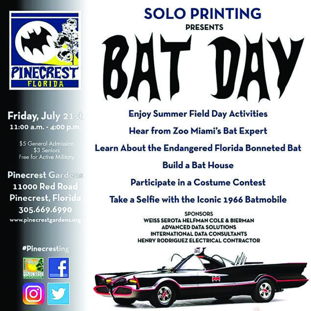 Finally, rounding out our activities in the month of July, on July 21 the Village of Pinecrest is hosting Bat Day…a day celebrating those mysterious nocturnal creatures that do so much to help us pollinate our flowers and eradicate tens of thousands of mosquitoes because of their voracious appetite for insects. Not only will there be educational activities with Zoo Miami’s bat expert on hand to tell us all about these fly-by-night friends, but there will be special bat arts and crafts, bat house building demos and we’ll even have the famous bat mobile on site for a little taste of Hollywood Glam! Could it be Bat Man himself pays us a visit…you’ll just have to visit the Gardens that day between 11 a.m. and 4 p.m. on the July 21 to find out for yourself!