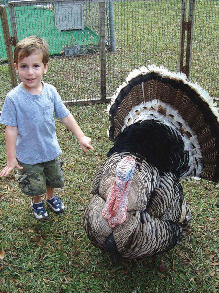Two-year-old Jordan Diamond gets an upclose look at Tom, a full-grown turkey, during a recent educational visit to the Bet Shira Early Childhood Center by animals from the Little Farm Petting Zoo. The animals — including goats, sheep, ducks, rabbits and baby chicks – were taken to the private preschool and kindergarten to help the children understand the concept of the Thanksgiving holiday on Nov. 22.