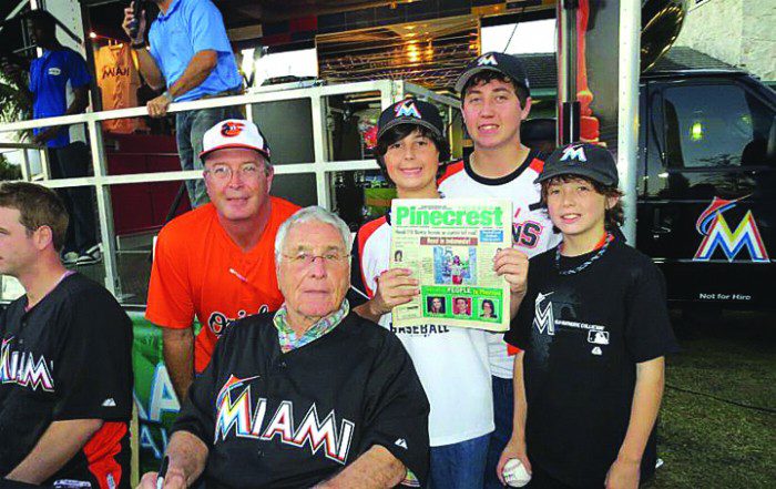 That’s Jack McKeon, the former manager of the 2003 World Champion Florida Marlins, sitting in front of Richard Lopez and sons John, Marc and Chris during Marlins Night at a recent Howard Palmetto Baseball and Softball event at Suniland Park. Of course they remembered to take along a copy of their favorite hometown newspaper. Thanks for thinking of us, guys!