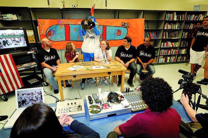 morning announcements at Pinecrest Elementary School during Marlins Ayudan Week 2013.