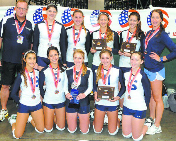 The Miami Elite 15Blue, a Palmetto Bay girls’ club volleyball team, finished second in the USA Volleyball Junior National Championships in Atlanta, taking home the silver medal and proving they belong with the nation’s best teams. The traveling team competed in 11 tournaments last season, winning four gold and four silver medals. Pictured are (front row l-r) Teresita Bernace, Katerina Salgado, Susannah Forbes, Jennifer Ceballos, Kelsey Taylor; (back row l-r) assistant coach Scott Doan, Taylor David, Danielle Littke, Sylvia Hernandez, Brooke McDermott and head coach Julie Doan. For more information, go to www.miamielite.net.