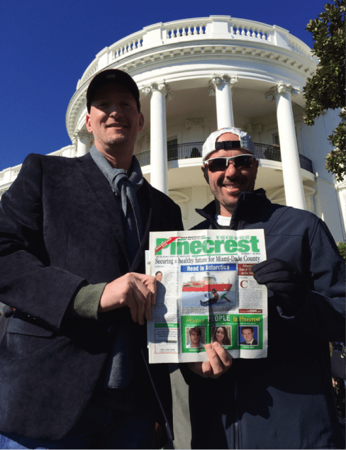 Pictured is Pinecrest Fitness owner Mike Estevez with Village resident Marc Tendler outside the White House in Washington D.C. awaiting the start of the 38th annual Marine Corps Marathon. Of course they remembered to take along a copy of their favorite hometown newspaper and snapped this shot for us. Thanks for thinking of us, guys!