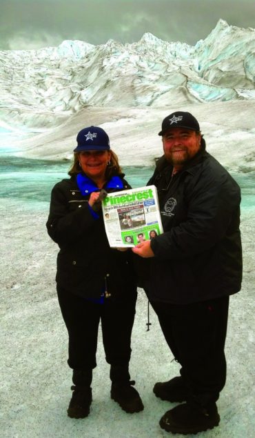 Read in Juno, AlaskaHere’s Pinecrest resident Steve Schwartz, commissioner of the Howard Palmetto Aces, with his wife Cindy Schwartz, at the top of the Hubert Glacier near Juno Alaska. Steve claims that he will travel to the ends of the earth to recruit players for his Howard Palmetto baseball team. Of course, he always takes along a copy of his favorite hometown newspaper. Thanks for thinking of us, Steve.