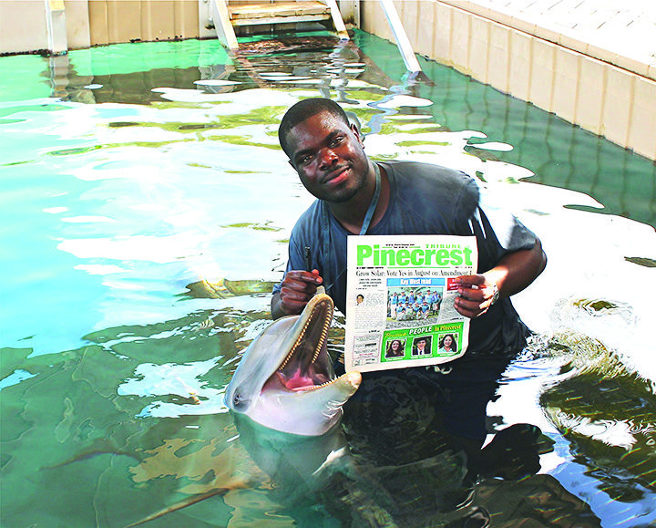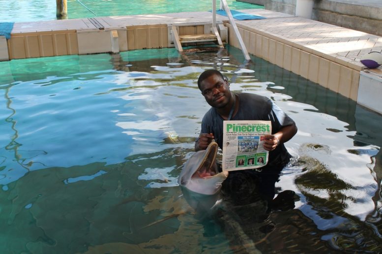 Our roving photographer was in the Bahamas on Blue Lagoon Island, the home of Dolphin Encounters, and ran into the dolphin trainer Rico and Cacique reading their favorite newspaper.