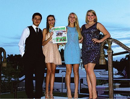 All dressed up and ready to go to the Palmetto Senior High School Homecoming dance are (l-r) Travis Rambo, Sarah Waters, Amber Mohlman and Julia Finazzo. Of course they paused a moment to get their picture snapped with a copy of their favorite hometown newspaper. Thanks for thinking of us, guys!