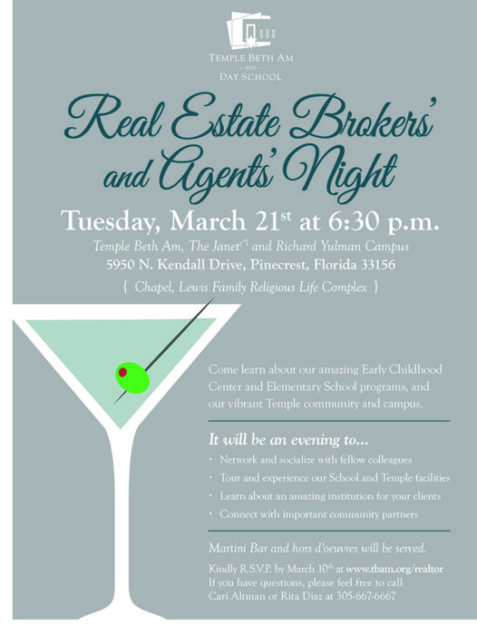Many realtors that have strong ties to the Pinecrest, Palmetto Bay, Coral Gables and South Miami areas have referred their clients to Temple Beth Am on numerous occasions. These real estate professionals feel it’s their responsibility to know the ins and outs of our community and offer their clients the very best service and information. We look forward to seeing you on March 21.