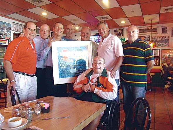 On hand at the Big Cheese to pay tribute to Coach Diaz were former swimmers Doug Hartman, Steve Lichtner, John Spire, Kurt Weinants and Ken Groce, along with his son John Diaz, who was also a UM swimmer, and UM director of alumni programs Rick Remmert.